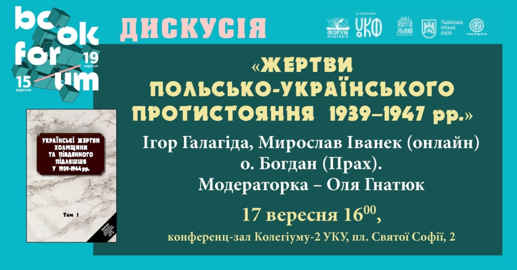 17 вересня в приміщенні конференц-залу нового колегіуму УКУ, пл. Святої Софії, 2 (колишня адреса: вул. Козельницька,2), о 16:00 відбудеться дискусія «Жертви українсько-польського протистояння 1939–1947 рр.», присвячену виходу першого видання в рамках однойменної дослідницької програми «Українські жертви Холмщини та південного Підляшшя у 1939–1944 рр.».