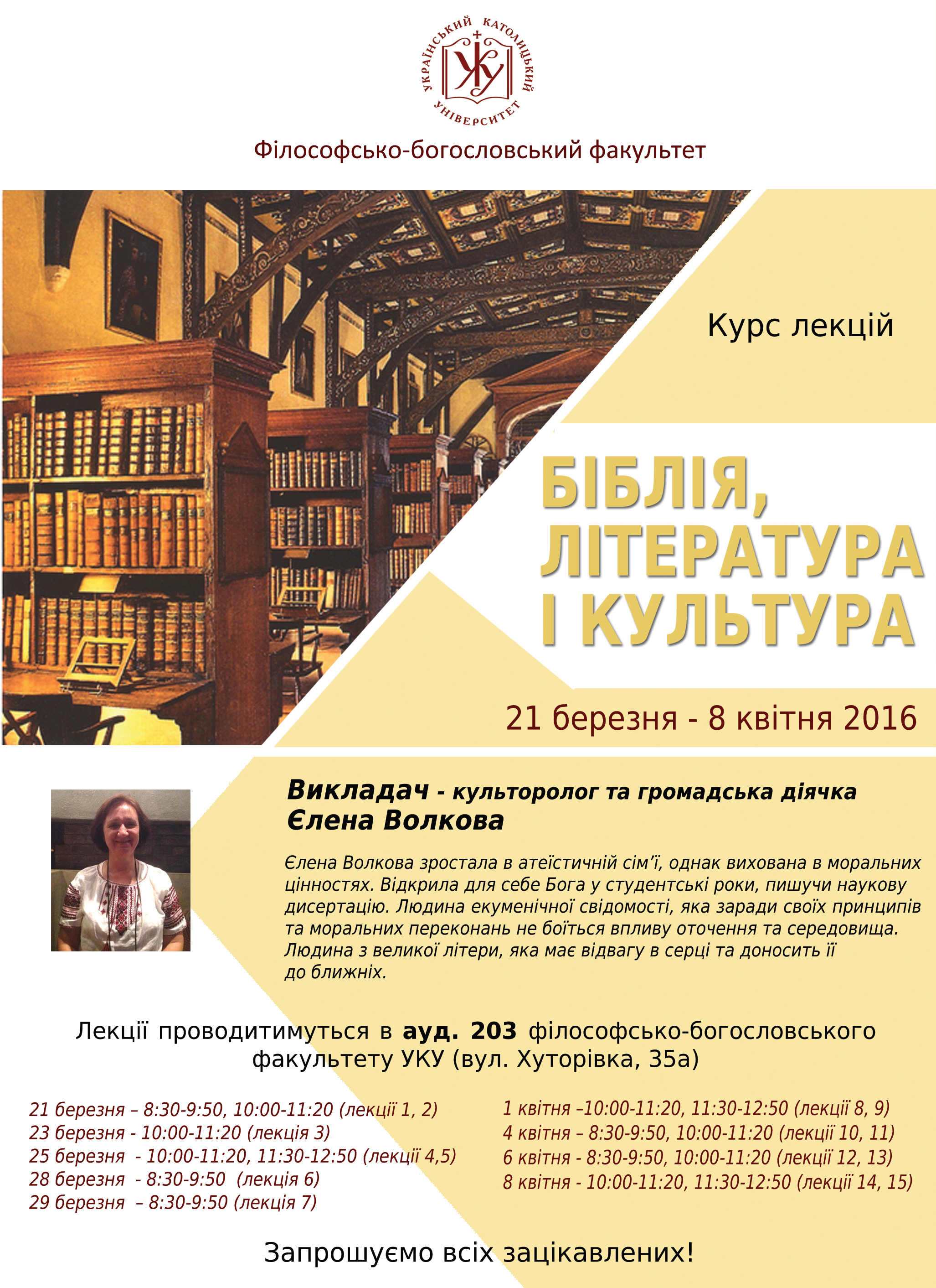 Курс лекцій Єлени Волкової «Біблія, література і культура» Monday, 21 March, 2016 Sorry, this entry is only available in Ukrainian. Digest of events and news Get the weekly newsletter of UCU events and news in your mailbox ПІДПИСАТИСЬ Similar events Saturday, 21 August, 2021 Charitable round table: “Those who forged Ukraine’s independence” Monday, 13 September, 2021 UCU Days: 30 Years of Ukrainian Independence. What Kind of... Saturday, 26 June, 2021 Opening of Collegium II, Graduation Saturday, 26 June, 2021 Commencement Ceremony at the Ukrainian Catholic University Thursday, 15 April, 2021 Презентація навчального курсу з цифрових навичок для медиків