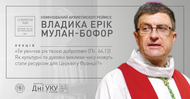 Запрошуємо всіх охочих на лекцію Номінованого Архиєпископа Реймсу, Владики Еріка Мулана-Бофора “Культурні та духовні виклики часу як ресурс для Церкви у Франції”.