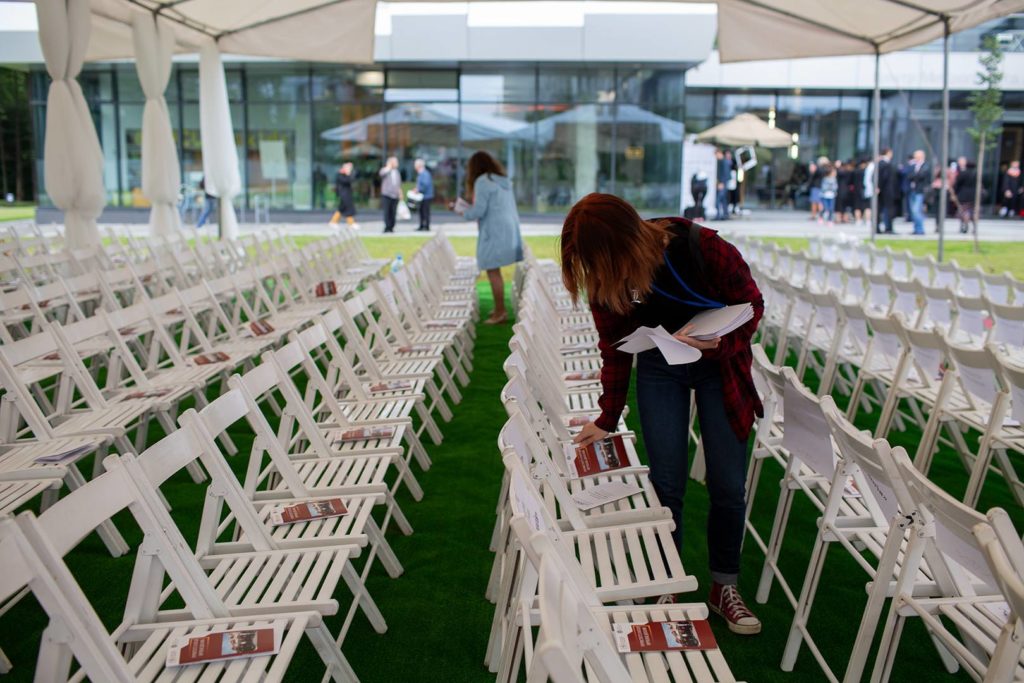 Продумати довелося чимало: сцена, шатро, білі дерев’яні стільці на килимовому покритті, фотозони, багато-багато живих квіткових композицій і навіть фотобокс. Чи не буде проблем із обладнанням, а найважливіше – зі звуком, щоб наші глядачі могли переглянути урочистості онлайн, чи все розпочнеться вчасно і не виникне ніяких форс-мажорів і чи не зіпсує усе дощ, який от-от розпочне падати? Питань більше аніж достатньо, але найважливіше з усього, що не має знаку питання, – так це настрій. Усі довкола усміхненні і щасливі.