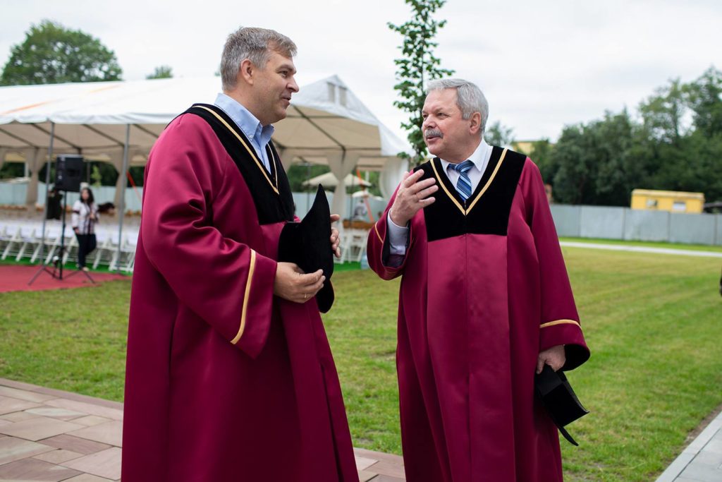 …А ось і проректори у бордових мантіях. Бчимо Проректора з призначення та місії УКУ Мирослава Мариновича, який стоїть у товаристві друга. Пан Мирослав, як завжди, радо погоджується на коментар. “Як вам новий формат випускного?” – питаю. “Це щось дуже природнє для УКУ. Пригадую, як на ректораті ми говорили про цю площу перед храмом, уявляли, що колись саме тут відбуватимуться урочисті моменти. І ось це “колись” – “сьогодні”, – каже Мирослав Маринович.
