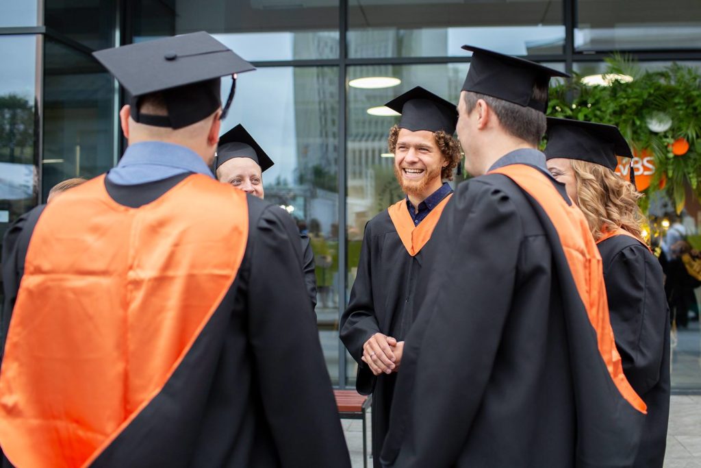 А ось і почали збиратися випускники бакалаврських та магістерських програм: усі в довгих мантіях, втім у кожної програми комірець іншого кольору. Відтак, випускники починають творити помаранчеві, сині, зелені, голубі острівці спілкування. Хтось просто розмовляє між собою, хтось вже робить перші селфі, а хтось дзвінко сміється і можна лише здогадуватися, про що ж таке веселе вони балакають.