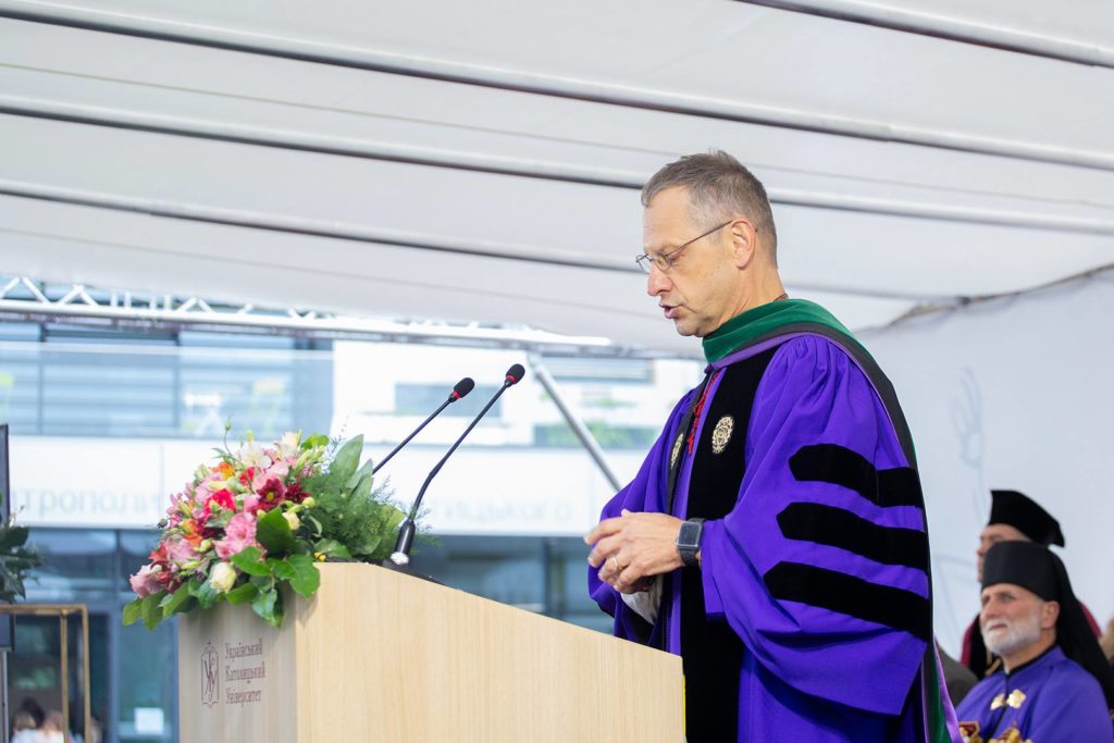 До слова запрошують отця-ректора УКУ Богдана Прах. У його словах вдячність і, здається, молитва: “Дорогі випускники, ваші викладачі, батьки чи опікуни упродовж цих років немов ті свічки згоряли заради вас, сповна віддаючи любов. Тому закликаю вас передавати ці знання, людяність та любов, яку ви отримали. А це ще й означає: не бійтеся йти вперед, боротися за правду, за Україну, за цінності, служити нашій державі. Ви саме для цього завершили навчання”, – каже отець-ректор.