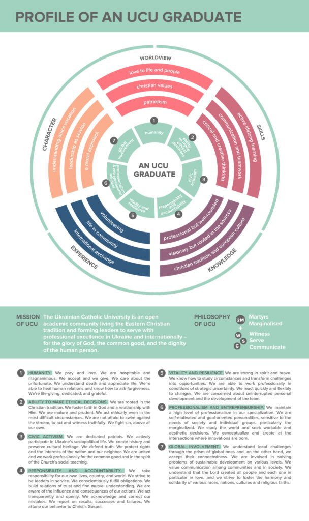 The Ukrainian Catholic University has developed a profile of a graduate which includes seven criteria: humanity, the ability to make ethical decisions, professionalism and entrepreneurship, civic activism, global involvement, responsibility and accountability, and vitality and adaptability. The profile is a summary of work and discussions with focus groups of teachers, students, program leaders, and potential employers, and has been approved by the Rector’s Office and the UCU Senate.