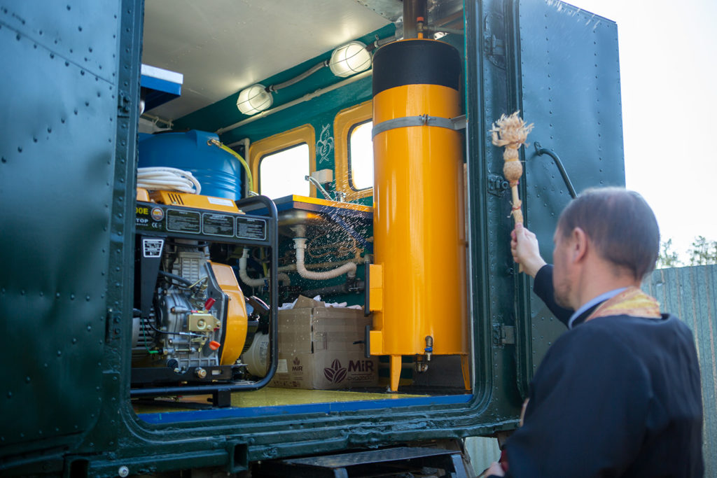 “Це банно-пральний комплекс з запасом води – тисячу літрів. Сюди вмонтовані душові кабіни, рукомийники, пральні машини, насос підкачки для забезпечення потрібного тиску для пральних машин та підготовки гарячої води бойлером.Також є дизель-генератор – автономне живлення, яке не потребує під’єднання до мережі. Машину можна запустити і в польових умовах, і у стаціонарних – підключати до електромереж. Каркас автомобіля теж був не у найкращому стані і доводилось переробляти практично все: і дно, і облицювання”.