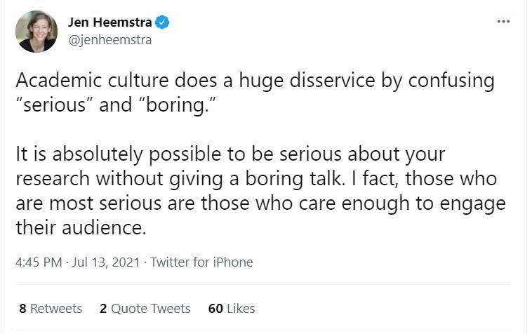 Недавно я натрапила на твіт однієї американської професорки, який дуже добре роз’яснює суть проблеми. Вона пише буквально таке: «Академічна культура робить ведмежу послугу плутаючи “серйозне” і “нудне.” Цілком можливо бути серйозним у власному дослідженні без нудних доповідей. Ба більше, найсерйознішими є ті, які дбають про залучення аудиторії».