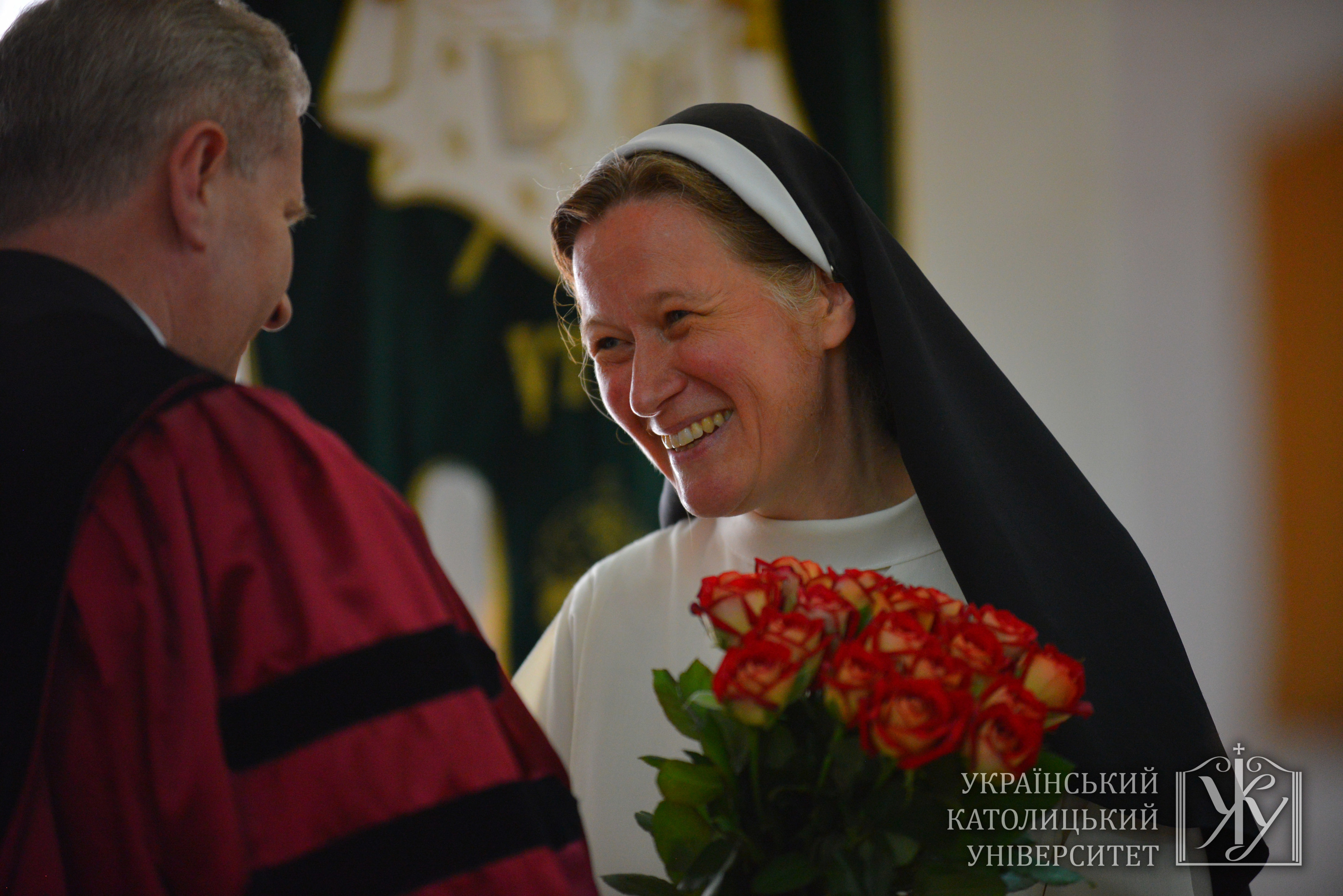 Цьогорічним спеціальним гостем випускних урочистостей була с. Хелен Елфорд, віце-декан факультету соціальних наук Папського університету св. Томи Аквінського в Римі. Вона вже не вперше приїздить в УКУ. Так, в кінці квітня вона презентувала український переклад своєї книги «Покликання лідера бізнесу» в Університеті. Саме про «гуманізацію праці», «соціальну якість» та те, як Церква може впливати на цей процес с. Хелен і присвятила свою доповідь. Її підсумком стало твердження про те, що «Церква стане лідером, тому що те, що вона може запропонувати у філософському, культурному і духовному плані, визнають важливим. Чи не є це ще одним способом подумати про нову євангелізацію? І тут, очевидно, католицька Церква в Україні і молоді фахівці, якими є Ви, а також УКУ можуть відіграти особливо важливу роль. Ви звикли жити у «прикордонні» – не стільки між Сходом і Заходом, хоча це також має значення, скільки між кризою і надією. Той, хто вміє жити в такому напруженні і використовувати його творчо, впроваджувати інновації і народжувати нові ідеї та нове життя для людей, стануть культурними лідерами майбутнього».