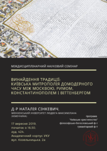 17 вересня, у вівторок, до УКУ завітає д-р Наталя Сінкевич (Мюнхенський університет Людвіга-Максиміліана, Німеччина), яка у рамках міждисциплінарного наукового семінару програми “Київське християнство” виступить з доповіддю «Винайдення традиції: Київська митрополія домодерного часу між Москвою, Римом, Константинополем і Віттенбергом».
