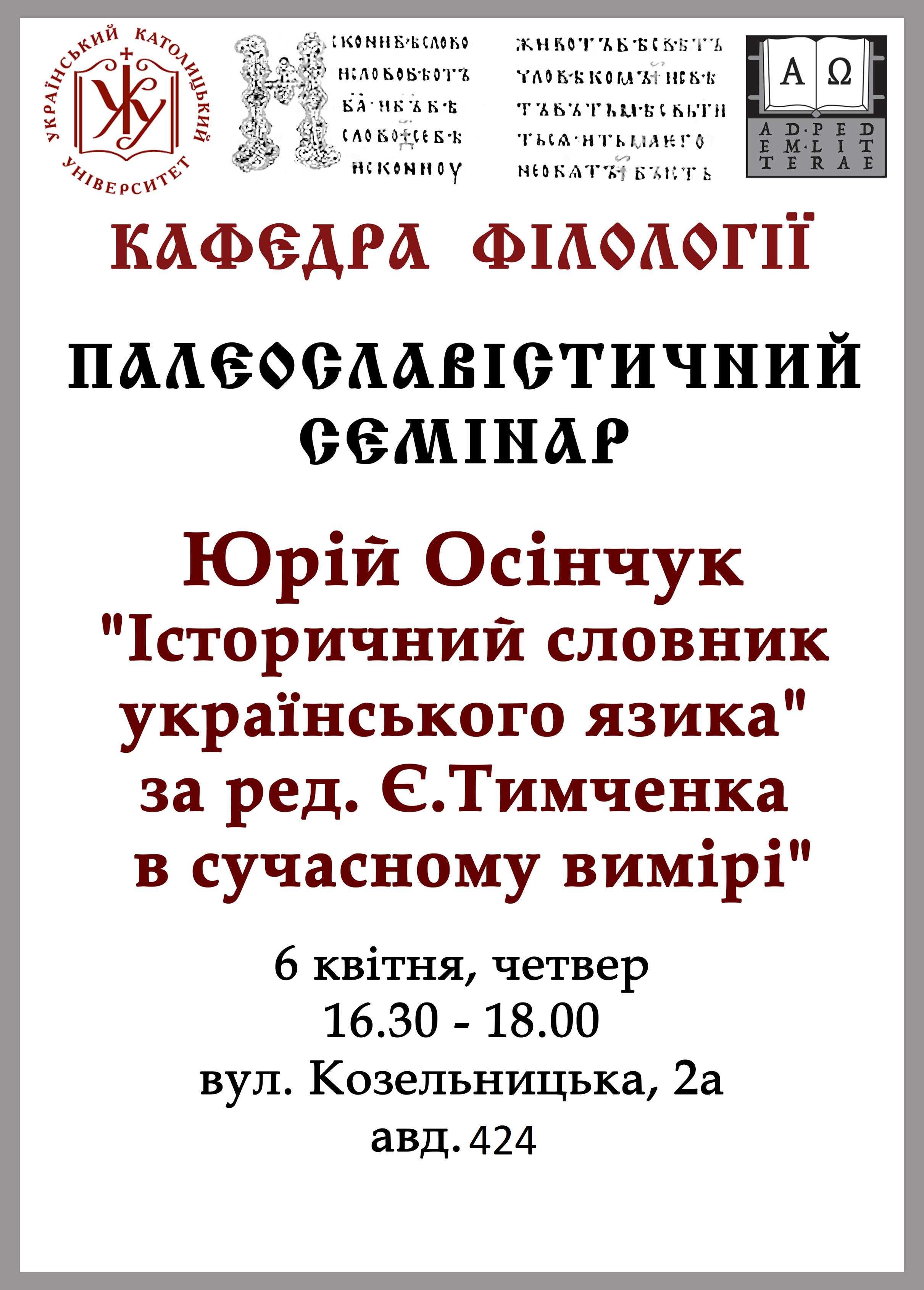 Програма філології УКУ запрошує у четвер, 6 квітня 2017 року , на палеославістичний семінар «”Історичний словник українського язика” за ред. Є.К. Тимченка в сучасному вимірі».