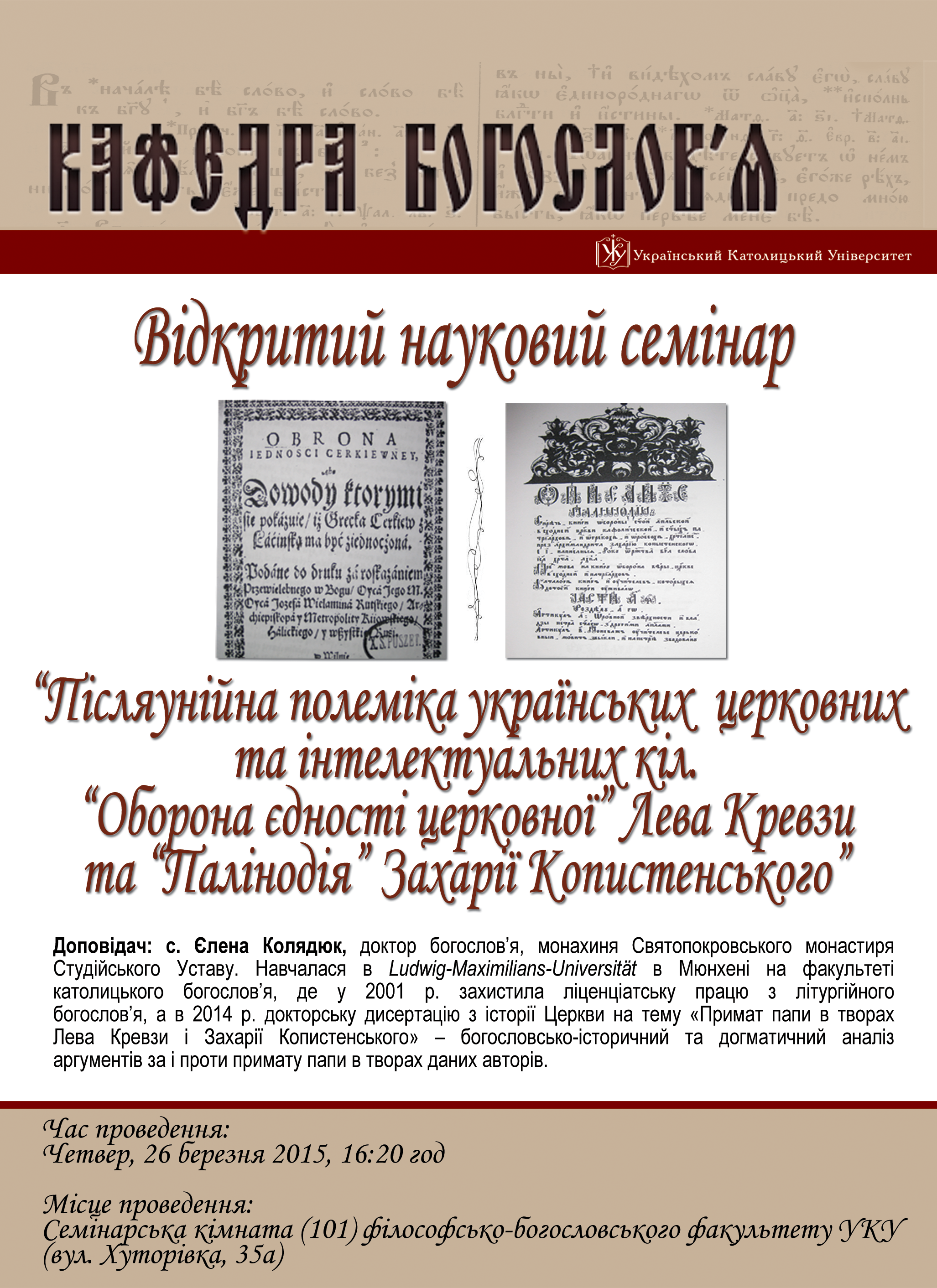 Семінар “Післяунійна полеміка українських церковних та інтелектуальних кіл” Четвер, 26 Березня, 2015 Дайджест подій та новин Отримуй тижневий дайждест подій та новин УКУ у свою поштову скриньку ПІДПИСАТИСЬ Схожі події Вівторок, 1 Березня, 2022 Лекція-бесіда з Ярославом Грицаком Середа, 2 Березня, 2022 Russian War of Aggression: What are the Consequences for Ukraine? Середа, 23 Лютого, 2022 Міжнародна конференція «Соціальна справедливість, права людини та загальне благо» Вівторок, 22 Лютого, 2022 Чи(м) закінчилася Революція Гідності? — зустріч-дискусія із студентами Середа, 23 Лютого, 2022 Перша зустріч спільноти Українська молодь Христові (УМХ)