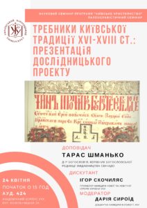 24 квітня 2018 р. відбудеться спільний міждисциплінарний науковий семінар програми «Київське християнство» та палеославістичний семінар кафедри філології на тему: «Требники київської традиції XVI–XVIII ст.: презентація дослідницького проекту»