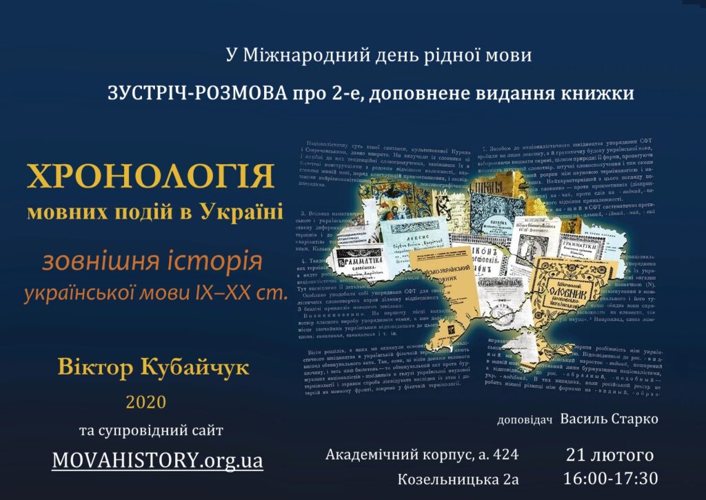 Кафедра філології запрошує в п’ятницю, 21 лютого, на зустріч-розмову про друге, доповнення видання книжки Віктора Кубайчука «Хронологія мовних подій в Україні. Зовнішня історія української мови» (К.І.С., 2020), супровідний сайт movahistory.org.ua та дальший розвиток проєкту.