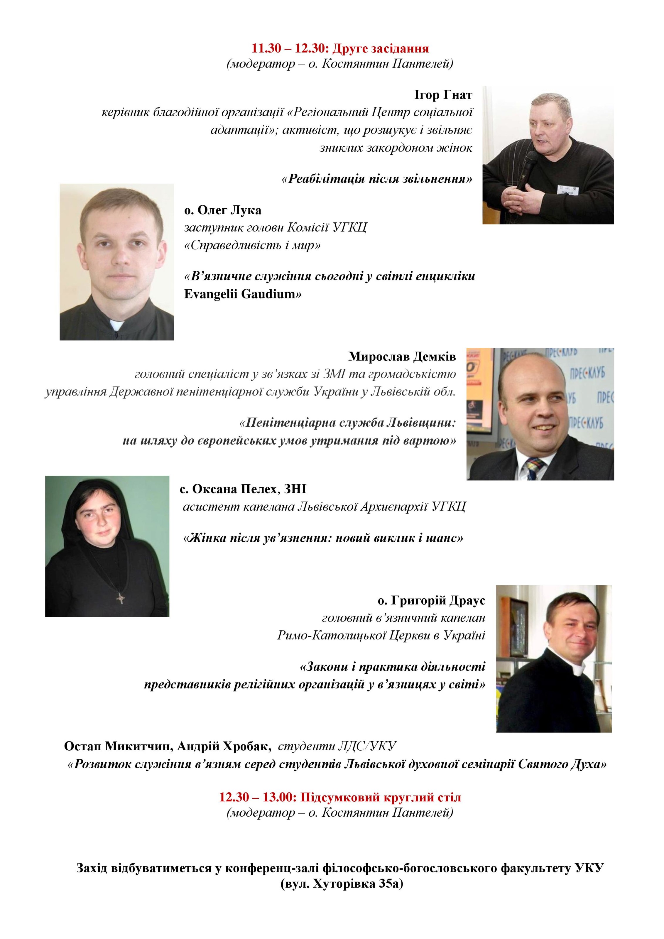 penitenciarne_dushpastОрганізатором круглого столу є Філософсько-богословський факультет УКУ, зокрема кафедра пасторального богослов’я, у співпраці з Пенітенціарним душпастирством УГКЦ.