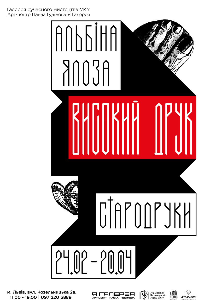 24 лютого в Галереї сучасного мистецтва УКУ (вул.Козельницька, 2а) о 17.00 год. відбудеться відкриття виставки Альбіни Ялози «Високий друк». Основна частина експозиції – львівські видання: книги друкарні Львівського Успенського братства, яка діяла з 1591 до 1939 р., найактивнішої львівської приватної друкарні Михайла Сльозки (1638–1670) та найновіші (2014-2015 рр.) – ліногравюри сучасної української художниці Альбіни Ялози.
